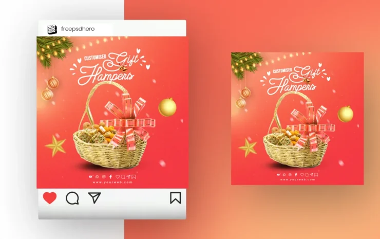 Download the Christmas gift hamper free PSD template. This Free PSD Template is made for restaurants, cafes, gift shops to promote their gift hampers on all social media channels and reach their potential customers, and inform their followers about the gift hampers.