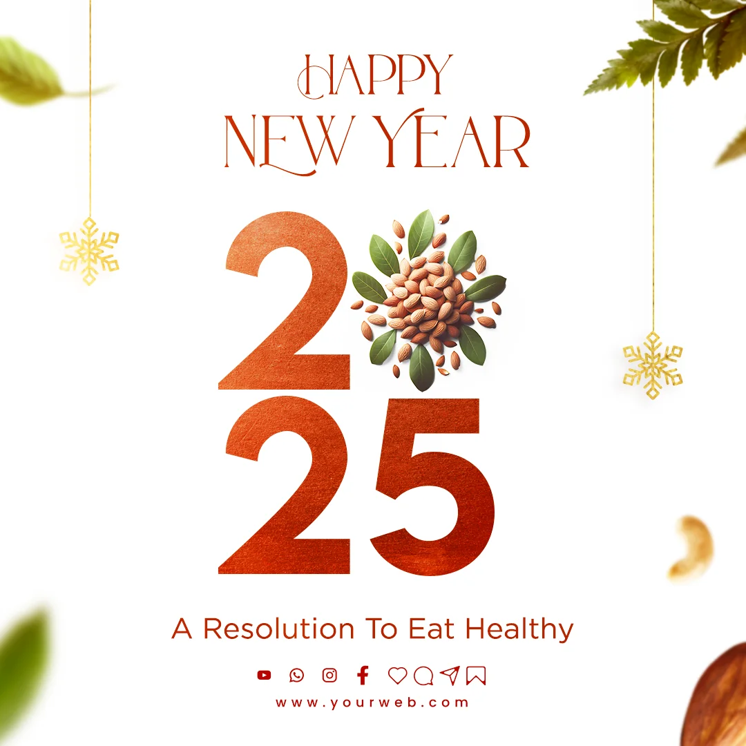 Welcome this New Year with this Free Eco-Friendly Dry Fruits Happy New Year Wishes PSD Template. Perfect for promoting your healthy dry fruits, and eco-friendly store, this template is ideal for sharing your greeting with your audience, customers, and followers on social media with an eco-conscious touch.